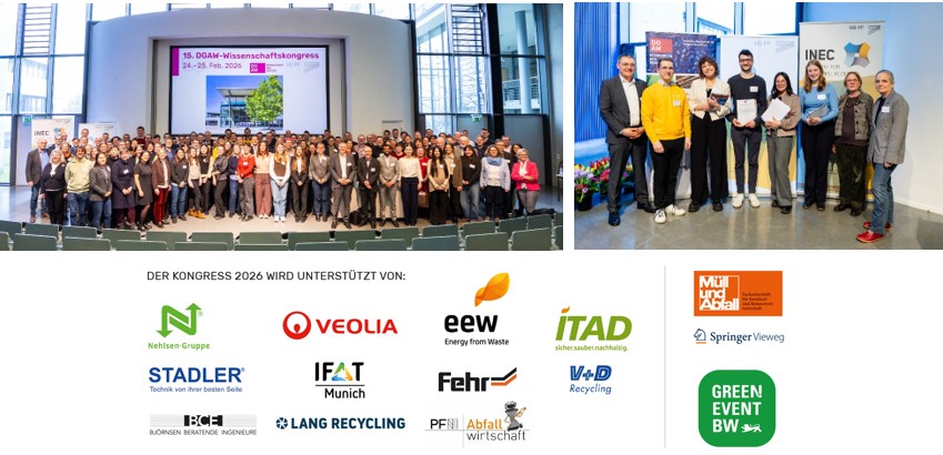 Auch 2026 wurde der DGAW-Wissenschaftspreis an die jeweils drei besten Beiträge in den Kategorien Vortrag und Poster vergeben. Einen Sonderpreis vergab wie im Vorjahr auch die ITAD (Interessengemeinschaft der Thermischen Abfallbehandlungsanlagen in Deutschland).